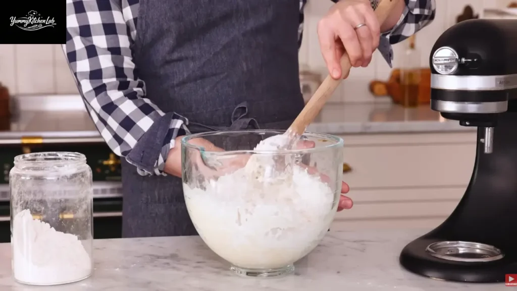 Add 4½ cups (540 grams) of bread flour and 2 teaspoons of salt to the bowl. Before you attach the dough hook, stir the mixture by hand with a spatula or wooden spoon until you get a rough, shaggy mass. This tiny step saves you several minutes of mixer time and keeps flour from launching itself all over your kitchen.