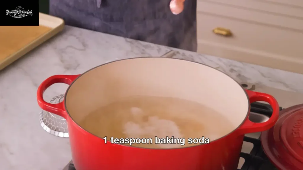 Once the water hits a boil, reduce the heat to a simmer and add three tablespoons of brown sugar and one tablespoon of baking soda. Stir carefully because the baking soda will cause the water to bubble up aggressively for a moment. Don’t panic. It settles down.