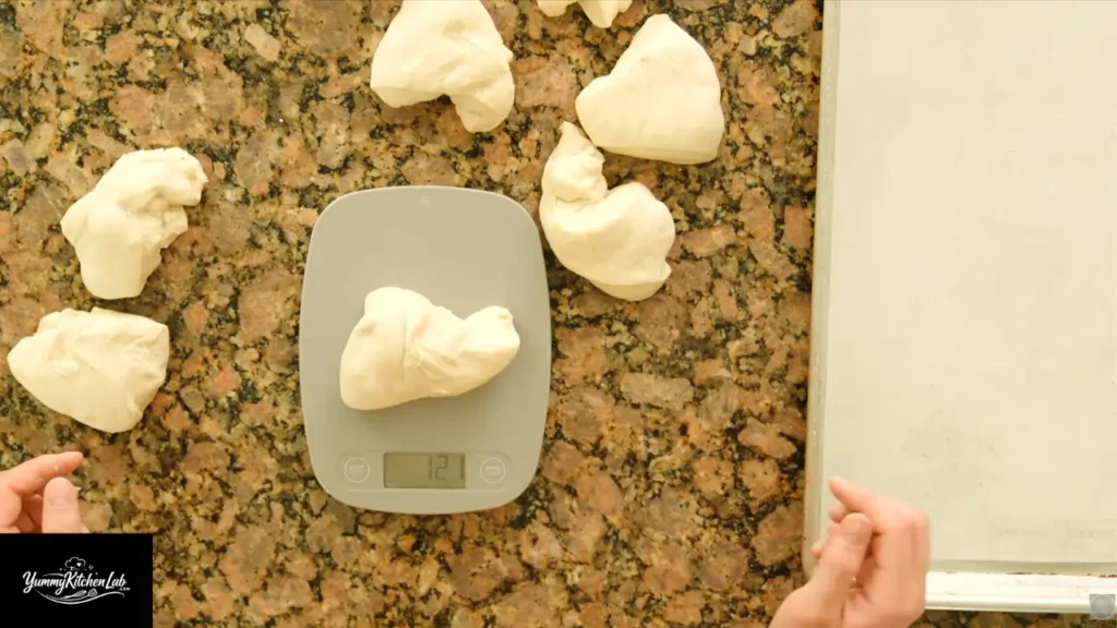 - Divide into 8 pieces of roughly 115g each. Shape into tight dough balls.