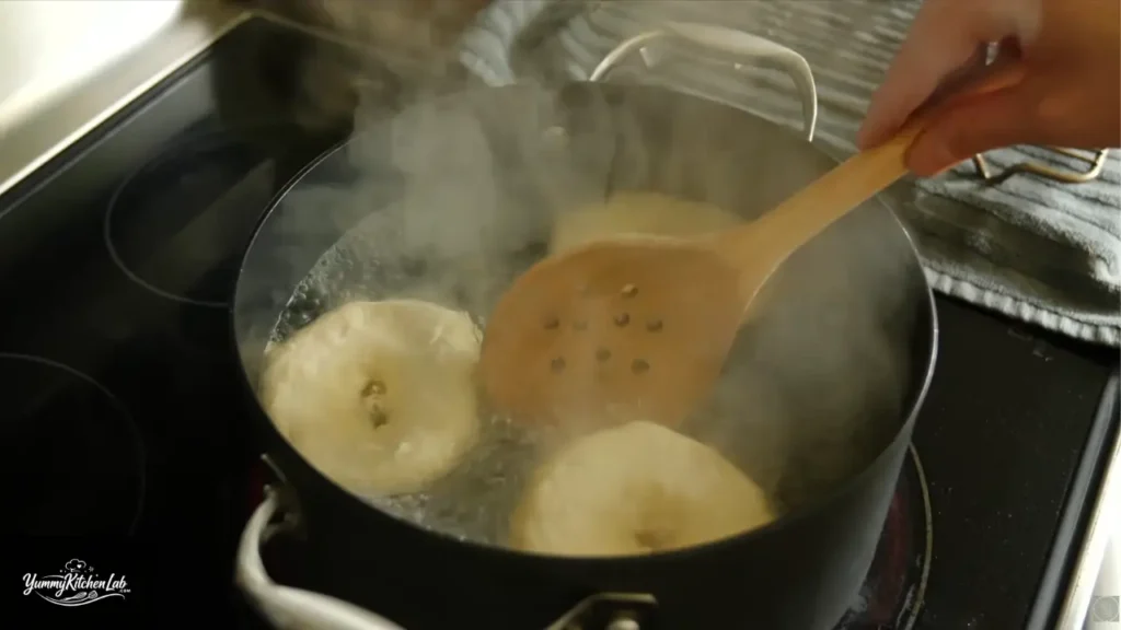 - Boil a pot of water with 20g honey. Boil each bagel 30 seconds per side.