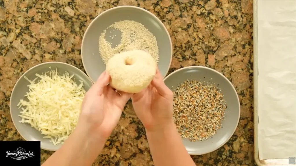 While the bagels are still slightly damp from boiling, dip them into your chosen toppings. Everything bagel seasoning, sesame seeds, and asiago cheese all work beautifully.
