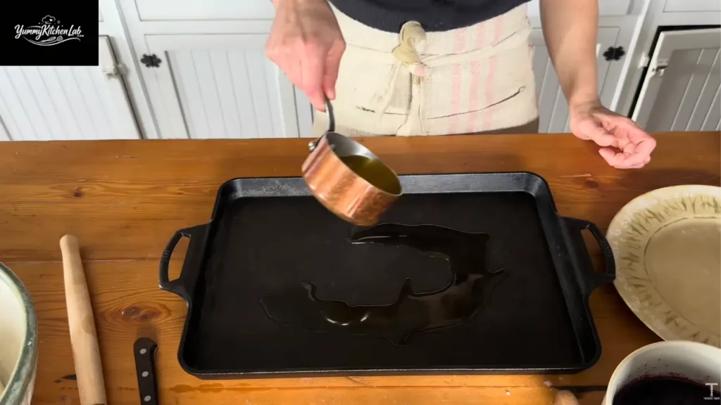 Melt ghee generously in your baking pan. Like, more than seems reasonable. Pour in your puffy dough and gently spread toward the edges. Don’t stress about perfect coverage.