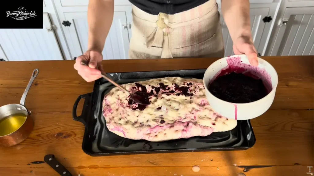 For berry version: drizzle cooled compote over the dough, fold edges over to partially enclose, then flip seam-side down. Rest another 20-60 minutes while the oven heats.