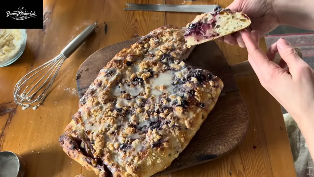 Drizzle powdered sugar glaze over the hot focaccia. The heat helps it soak in rather than sitting on top like armor. Now comes the torture: wait 10-15 minutes before cutting.